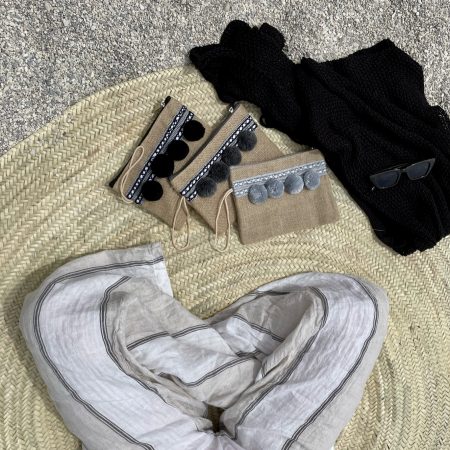 Χειροποίητο τσαντάκι με σκούρες γκρί φούντες.